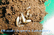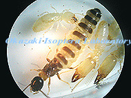 全体に皮膚の薄いシロアリで、とくに職蟻は「きんつば」のように腹部が黒く透けて見えます。だから、ながく外気に触れていることはできませ