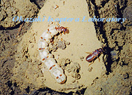 タイワンシロアリでは職蟻は兵蟻同様に戦闘的で、ながく素手で触っていると職蟻に噛みつかれます。もちろん痛くありません。