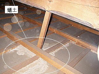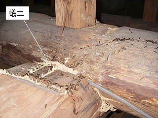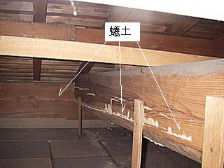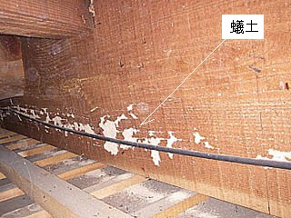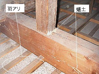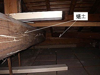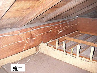 屋根を支える小屋組の被害が目立つイエシロアリと比べれば、ヤマトシロアリの被害の多くは土台や床組材に見られるというのは事実です。しかし、ヤマトシロアリの高所被害や高所営巣は必ずしも例外的ではなく、数は少ないとはいえこれまでもしばしば見られた一般的な現象です。 一部の書物では「ヤマトシロアリは水を運ぶことができないので湿った木材しか加害できず、建物の低い場所でしか生息できない」などと説明されていますが、それは事実に合いません。 また、ヤマトシロアリの高所被害をもっぱら雨漏りや特定の条件で説明するのも無理があります。 |