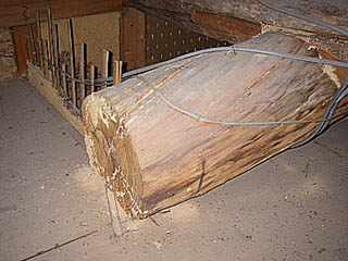 ![]() 玄関の天井裏の被害。 玄関の内外から羽アリが出るということで天井裏を調査したところ、松の丸太と軒桁に被害があったのです。 この家も雨漏りはまったくありません。 シロアリは玄関の外壁基礎からかなり太い蟻道を構築して天井に侵入していました。 この基礎の蟻道部分はコンクリートの露出高が低く、数センチ離れたところの植裁が覆うような状態となっていましたが、これがシロアリに有利な条件を与えたようです。(富山市内) |