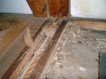 ![]() 二階の被害。 この家では二階の押入れの敷居が被害に会いました。ちょうどその時NHKの報道番組でアメリカカンザイシロアリが取り上げられていて、「ヤマトシロアリは建物の低い部分を加害するが、アメリカカンザイシロアリは建物の高いところを加害する」という間違った説明が行われたことから、居住者は当初アメリカカンザイシロアリと思い込んでいました。 しかし、明白な蟻土があり、直下のヤマトシロアリ被害部から蟻道でつながっていたものでした。 もちろん、ここも雨漏りはありません。(岐阜県内) |