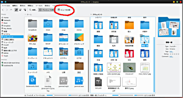 ・ウインドウの拡大、縮小、移動WindowsだとAlt+Spaceでメニューを出してから項目を選んで行うのですが、LinuxならAlt+マウス 左で移動、Alt+マウス 右で拡大・縮小と、ごく簡単。![]() ![]() ・ウインドウの分割Windowsでは拡張機能を導入しないといけないようですが、Linuxではほとんどの種類で標準装備です。ファイルなどの移動・コピーではファイルマネージャーの画面を分割すれば操作に間違いがありません。 分割と単独表示の切り替えは、ツールバーのボタンやF3キーで行います。また、分割したそれぞれの画面でタブ分割もできます。 ![]() ・画像の全画面表示もダブルクリックだけでOKWindowsでは写真の全画面表示はF11キーですが、Linuxではビュー画面のダブルクリックだけでOK。全画面からプレビュー画 面への復帰もダブルクリックです。全画面になっても勝手にスライドショーは始まりません。また、画像の「送り」や「戻し」もマウスのルーラーでできます。 もちろんWindows同様にF11キーでの全画面や矢印キー操作もできます。