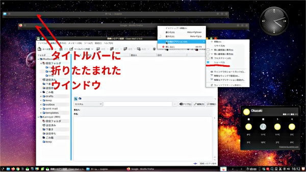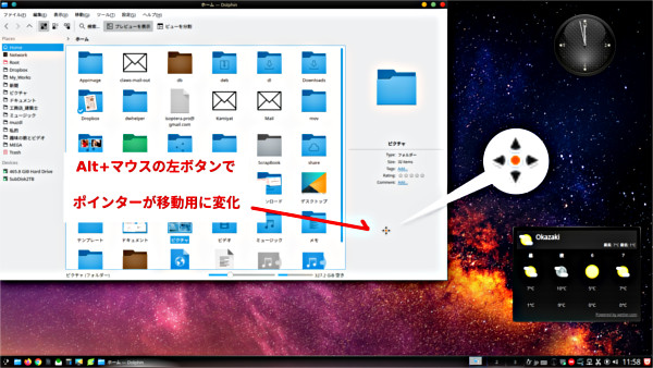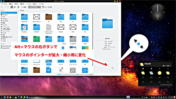 <--> ![]() ・ウインドウを折りたためますいくつかウインドウを開いている時、ちょっと避けておきたいウインドウをタイトルバーに折りたたんで、タイトルバーのみの表示にできます。 ・ファイルマネージャーの上で音楽・動画の再生ができます音楽や動画のファイルの整理で中身を確認するのに、いちいちプレーヤーを立ち上げる必要はありません。選択して再生ボタンを押すだけです。Linuxの種類によっては音楽ファイルに触れるだけで音が鳴るものもあります。