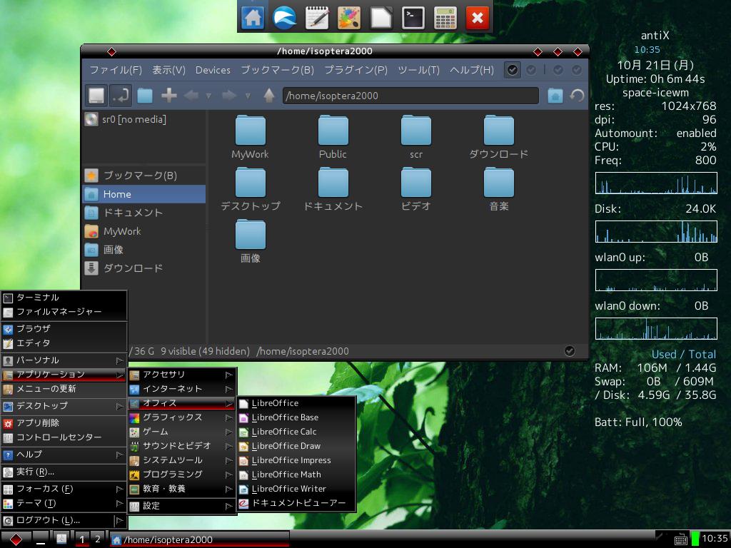 上は私が現在日常的に使用している中古PCのLinuxデスクトップ。