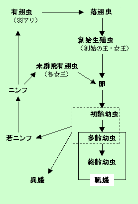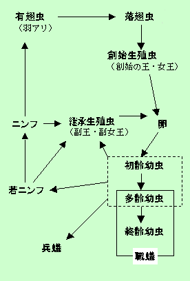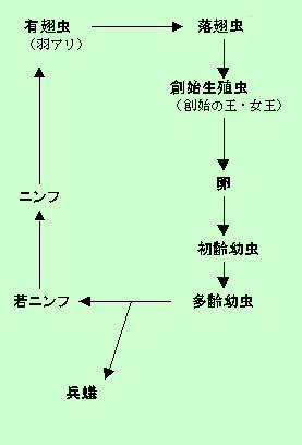 群飛した有翅虫(羽アリ)が生き延びて雌雄一対となって営巣すると、女王と王になります。これを創始生殖虫 primary reproductive (第一次生殖虫ともいう)といいます。