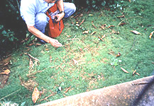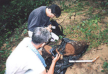 にもう一か所、平先生おすすめの場所があるというので立ち寄った。それは私たちのホテルに近い三亜の街はずれにある鹿回頭という半島だ。 ・・ここには観光の案内書にも載っている鹿回頭公園という美しい(行ってな いの で推測)公園もある。曲がりくねった道を登り、右手眼下に三亜市街が見え隠れするところに鹿回頭公園入口があった。しかし、平先生はそこ をすり抜けてさら に奥に進み、「三亜市人民政府」の看板が掛かった門をくぐったところで車を止めさせた。ここにはレンガ造りの人民政府の古い職員住宅や官 舎が点在し、全体 に太い樹木がたくさん生い茂っている。私たちの車がフォード社製の新品のワゴン車なのでやたらと目立つ。が、誰も出てこないし、気にとめ る人もいない。 ・・雨がぱらつく中私たちは最後の気力を振り絞って平先生とともに樹木をつ つい て回った。そして平先生の知り合いが住む職員住宅にたどり着いたところで、その建物につながる木柵に加害しているイエシロアリを発見し た。木柵にはかなり しっかりと蟻道がつけられ、虫もいた。 ・・こうなると、うずうずしてくるのが日本屈指のイエシロアリ技術者の柿原 さん だ。この巣はどこにあるのかということで、さっそく柿原さんは山根さんと付近を探し回った。私が木柵のイエシロアリの写真をやっと撮り終 えた時には、すで に彼らが土を掘ったり、木をたたいたりする音が聞こえてきた。おそらく何らかの見当はついたのかもしれないが、残念ながら本巣は見つから なかった。しか し、かなりしっかりしたノコバシロアリの巣が見つかったので、さっそくその職員住宅の横の土間で巣の解体を行った。 ・・わき目もふらずに解体に熱中しているところへ、そこの家の奥さんが自転 車で 帰って来てびっくりした様子。なにしろわけのわからない日本人が家の前や横でなにか汚いものをばらしているのだから。平先生がいろいろ説 明すると、ほっと した様子で家の中に入って行った。 ・・そうこうしているうちについにノコバシロアリの女王が見つかった。長さ 2cm程度で薄茶色の女王は、ただちにルーペで翅芽を観察し、創始の女王(第一次生殖虫)であることが確認された。しかし王は見つからな かった。平先生に 聞いてもこのシロアリの有翅虫の群飛時期などまだよくわかっていないようである。 ・・またこれとは別に「赤いイエシロアリ」を見つけた。なるほど一見すると 形と してはイエシロアリそっくりだ。しかし色が赤いのが特徴。 ・・このシロアリじつはイエシロアリの仲間ではなく、ゲンミゾガシラシロア リと いうシロアリで、額腺から前方に溝があり、イエシロアリやヤマトシロアリの属するミゾガシラシロアリ科のミゾガシラという名前のもとに なったシロアリなの である。平先生がこの日一番の目標としていたのがこのシロアリであり、そのために私たちをここに案内したのである。 ・・これまでに中国のゲンミゾガシラシロアリは、中国名・台湾原鼻白蟻Prorhinotermes japonicusと 同・西沙原鼻白蟻Prorhinotermes xishaensisの2種が記録されて いて、前胸背板が中胸背板より幅広いのが前者で、その逆が後者だという。この日採取したものがどちらの種であるかは、まだサンプルの整理 が終わってないの でなんともいえない。 |