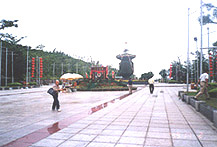 ら東の方に足を伸ばし、南山寺を目指した。 ・・20分も走ったところで平先生は道端に車を止めさせた。みると赤土のむ き出 しになった土手がある。そしてそこには私や山根さんには見覚えのある景色があった。つまり、タイワンシロアリの空腔(菌床が消失した空の 菌園)である。昨 年西表島で掘ったとおりの形であり、内部の滑らかさも同じである。そしてその土手の上には切り株があって、案の定タイワンシロアリがい た。日本と同じ種 だ。 ・・また、オオキノコシロアリMacrotermesも 見つかった。中国でのオオキノコシロアリは、キ バネオオキノコシロアリM. barneyiが 一般的で、タイ ワンシロアリとともに堤防に穴を開ける"堤防シロアリ"として駆除の対象となっているが、これはすでに前回の訪中時に、私たち(私と山根 さん)は広州の華 南植物園で採取している。 ・・また、中国でもっとも特徴的なものは雲南省に生息するツカオオキノコシ ロア リM. annandaleiで、墳墓形の塚 を作るという。ま だ海南島からは記録されてはいないのはわかっていたが、私はこれを一度見てみたかったので、「万が一」を期待して平先生に聞いてみた。し かし、種名は特定 できないが、やはりツカオオキノコシロアリではないという。 ・・1時間も走って南山寺に到着した。古臭くて陰気な寺院を想像していた私 たち は驚いた。駐車場のかなたには極彩色の巨大な門がそびえ、各所に売店のある広大な庭園が広がり、中国風の音曲が遠くから聞こえてくる。そ して本堂に行くに はここから専用のカートに乗るというのだ。なんという広さだ。 ・・3両連結のカートは経文が刻まれた巨大な石壁のある通路を抜け、手入れ の行 き届いた庭園を次々と見せながら、本堂に向かう。やがてデコレーションケーキのような純白の基壇の上に建てられた赤い建物の横を通過し た。さきほどから聞 こえていた音曲はここから聞こえていたのである。 ・・そして、正面の垂れ幕には華麗な音曲とは対称的に日本人だとつい世俗を 思い 出すような名前が書かれていた。その名も国宝「金玉観世音」。純金の観音像がまつられていて、ここだけ別途に入場料が必要だ。帰りに立ち 寄ったが、平先生 がわざわざ記念写真を所望するほど大変なものであるらしい。 ・・カートはいよいよ本堂に近づいた。甲高い声でマイク説明をする案内の若 い女 性に平先生が何やらつぶやいた。「日本人にわかるようにやってくれ」といったようだが、女性は手を振って笑っただけで、また甲高い声で説 明をつつけた。 ・・本堂は海を見下ろす小高い斜面にあって、屋根の稜線にはことごとくイル ミ ネーションの設備がある。だから夜に海から見上げればさぞきれいであろう。現在本堂内部を一部修理していて、上海から来ているという初老 の技師は平先生と 言葉を交わすなり私たちに木片を見せて話し始めた。それによるとダイコクシロアリの被害が多く、漆をしっかり塗って対処しているようだ。 ・・本堂の階段を下った広い庭の先端は海に面している。どこかで見た景色だ と 思ったら、昔見たことのある中国映画『紅色娘子軍(邦題・赤軍女性中隊)』を思い出した。海南島を舞台にしたこの映画で、悪の親玉の南覇 天が娘子軍に追い 詰められて撃たれ、最後にここから海に落ちたところで一斉射撃されて大団円となるあの場面である。 ・・そんなことを考えながら本堂を出た私たちはしばらく庭園の樹木をひとつ ひと つ丹念に調べた。ここにはイエシロアリ、タイワンシロアリ、ダイコクシロアリ、ノコバシロアリ、そしてオオキノコシロアリもいた。平先生 はゲンミゾガシラ シロアリを探していたがついに見つからなかった。 ・・ところで平先生が昼食のことを何度もいうのでよく聞いてみると、どうや らこ このレストランで食事するべきだといっている。シロアリを探しながらしばらく行くと、広い庭に白いテーブルを並べたファーストフード風の レストランが見え てきた。ここかと思ったら平先生はもっと先を指差し、お寺にしては立派すぎるようなレストランに案内した。 ・・かなり広くて高級そうなレストランだ。給仕がメニューを持ってきたが、 メ ニューがよくわからないので運転手の陳さんにすべて任せた。ただ平先生が椰子ジュースを注文したので、私たちも真似して注文した。ビール は日本の発泡酒の ようなやや薄口のものが多く、私は好きだが他の人はあまり口に合わないようだ。 ・・平先生によるとここの料理は肉や魚は一切使わずに肉や魚の料理のように 調理 するものらしい。山根さんが「それは日本の普茶料理と同じだ」という。出てきた料理は確かにおもしろい。見た目はエビだが実はコンニャ ク、見た目はハムだ が実は豆の加工品、大皿の魚も湯葉でくるんだ野菜だった。 ・・平先生が昼食にこだわったのは、つまりこれを私たちに食べさせたかった ので ある。 |