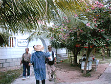 先生(広東省昆虫研究所)も同行し、いくつかの点で日中のシロアリ研究について交流することもできた。 ・・この調査に参加したのは私のほかには星野伊三雄さん(東海白蟻研究 所)、山 根坦さん(山根白蟻研究所)、柿原八士さん(柿原白蟻研究所)の3名であり、また薬剤メーカーの安芸誠悦さんも途中まで同行した。 ・・今回の調査の目的は、海南島に生息するシロアリのなかでも日本に生息し ない ノコバシロアリMicrocerotermes(中 国名・鋸白 蟻)やゲンミゾガシラシロアリProrhinotermes(中 国名・原鼻白蟻)というようなシロアリのサンプル収集であり、また日本ではほとんど見ることのできないタイワンシロアリOdontotermes formosanusによる家屋被害の調査で あった。 ・・10月31日の夜、海南島三亜市の鳳凰空港で、到着した私たち一行を 待って いたのは私の名前を大書した紙を掲げた平正明先生(広東省昆虫研究所)だった。平先生と私たちは1998年の訪中以来手紙のやりとりを し、そうしたなかで平先生にシロアリ調査をもちかけたので ある。そして、平先生は喜んで私たちの呼びかけに応じ、私たちの到着より2日も前に海南島に渡って「お土産」を準備していてくれたのだっ た。 |