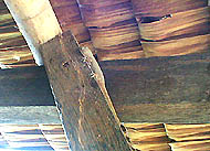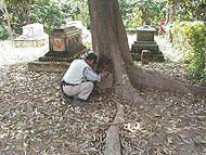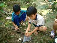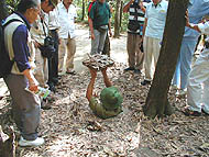 | ドリアン屋の建物のヤモリ | ドリアンの根元の巣をほじる山根さん | キイロマルガシラシロアリ |