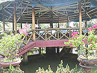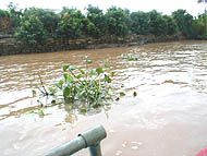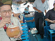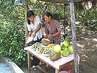 | 「サービス」のヤシジュース | 流れてくるホテイアオイの親分 | タイソン島農園の入口 |