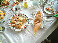 | 底には甘いもち米が残っている | たたんで切って食べる | 満足げな面々 |