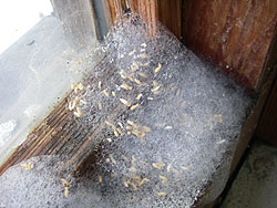 ![]() 窓枠の被害部に注入した薬泡により押し出されたヤマトシロアリ 泡は注入直後はしっかりとしたムース状ですが、しばらくするとこうしたまばらな泡になり、1時間もすれば消えてしまいます。 |
